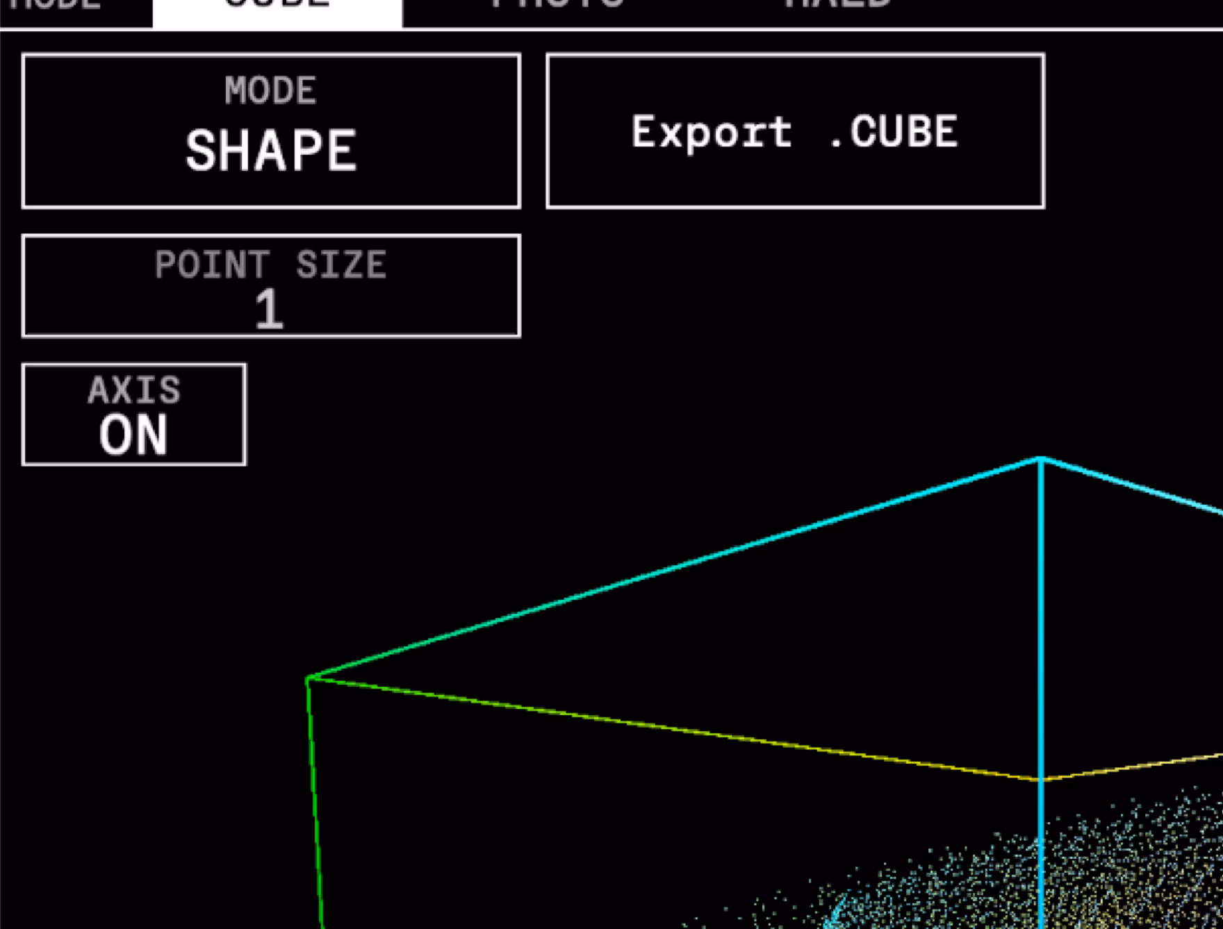 The first tab (keyboard shortcut: ⌘+1 on macOS/iPadOS) is the CUBE viewer, which displays a visualization of the loaded LUT in 3 dimensions.On macOS, click & drag to rotate the cube, and pinch on a trackpad/scroll on a mouse to zoom.