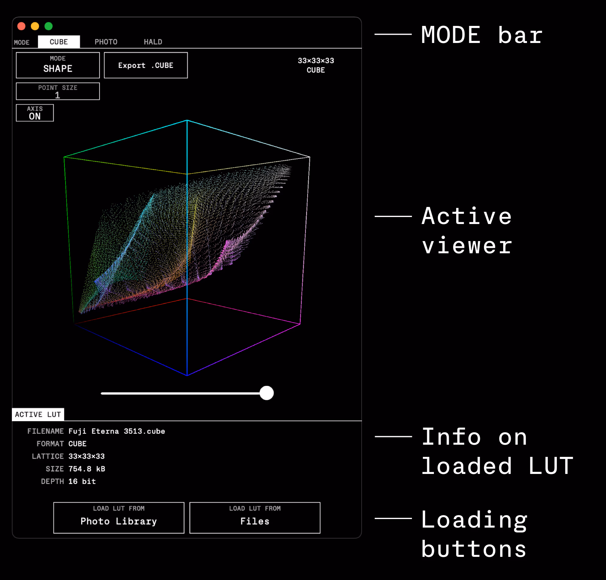 The MODE bar at the top lets you switch between the different viewers, detailed below.The ACTIVE LUT pane at the bottom gives you details on the currently loaded LUT.