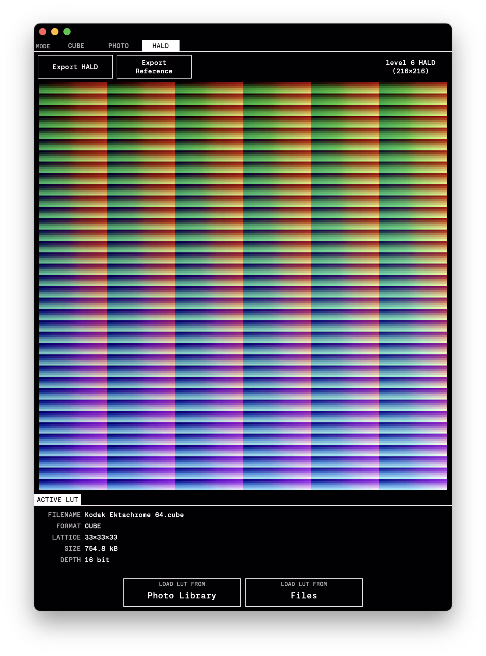 The third tab (keyboard shortcut: ⌘+3 on macOS/iPadOS) is the HALD viewer, which displays an alternative representation of LUTs, known as a HALD LUT.
